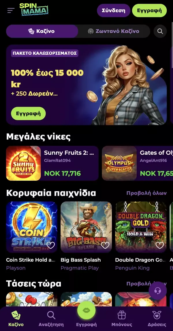 Η πλατφόρμα μας για κινητά είναι σχεδιασμένη ώστε να σου δίνει την ίδια επιλογή παιχνιδιών και τον ίδιο έλεγχο λογαριασμού που έχεις στο desktop, απλώς σε πιο μικρή διάταξη. Με το Spinmama κινητό, μπορείς να ανοίξεις μια συνεδρία στη μετακίνηση, στο διάλειμμα για φαγητό ή από το σπίτι, χωρίς να αλλάξεις τον τρόπο που παίζεις. Προσφέρουμε πάνω από 7.000 παιχνίδια σε κουλοχέρηδες, ζωντανό καζίνο, επιτραπέζια παιχνίδια, τζάκποτ και άλλα, με παρόχους όπως Pragmatic Play, Playtech, NetEnt, Nolimit City, Evolution και Yggdrasil. Θα βρεις επίσης σύγχρονες λειτουργίες όπως Αγορά Μπόνους (Bonus Buy) σε επιλεγμένους τίτλους κουλοχέρηδων, καθώς και ζωντανά τραπέζια με πραγματικούς dealers σε υποστηριζόμενες συσκευές.